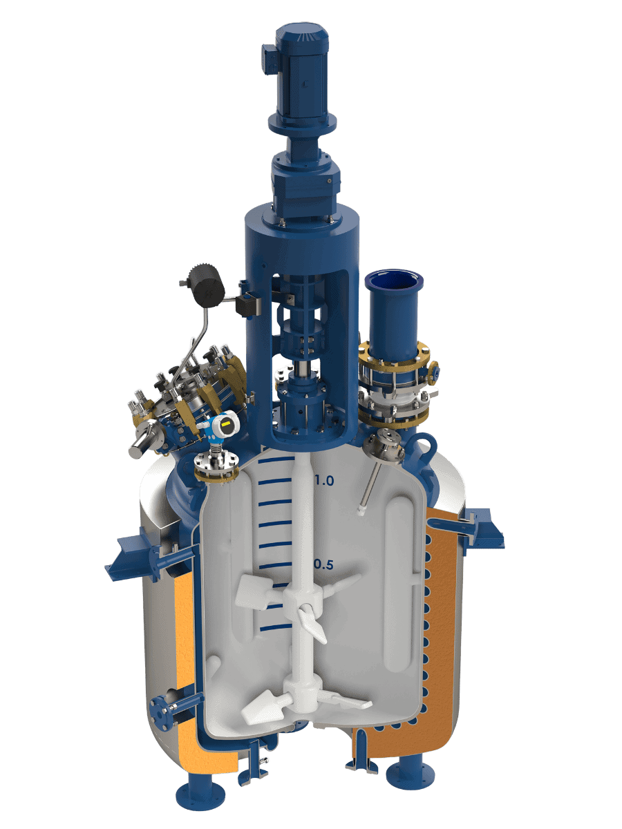 Im Vergleich zu herkömmlichen Reaktordesigns minimiert das OptiMix-Konzept® Totzonen und verhindert die Bildung von Wirbeln, wodurch ein homogeneres Produkt und eine verbesserte Prozesseffizienz gewährleistet wird. Zusätzlich bleiben alle Düsen für Prozessintegration, Instrumentierung und Reinigungssysteme verfügbar, was maximale Flexibilität für Ihren Betrieb bietet.